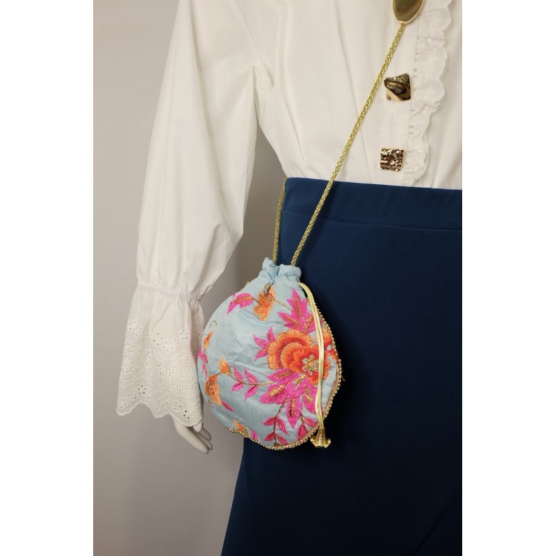 La Bombonera celeste bordada con mantón es una cartera elegante y refinada que combina el suave color celeste con un delicado bordado y un mantón, perfecta para ocasiones especiales.