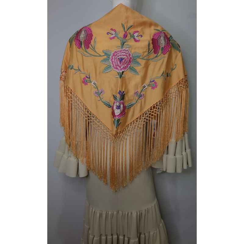 Mantón de seda naranja Bordado en tonos rosas