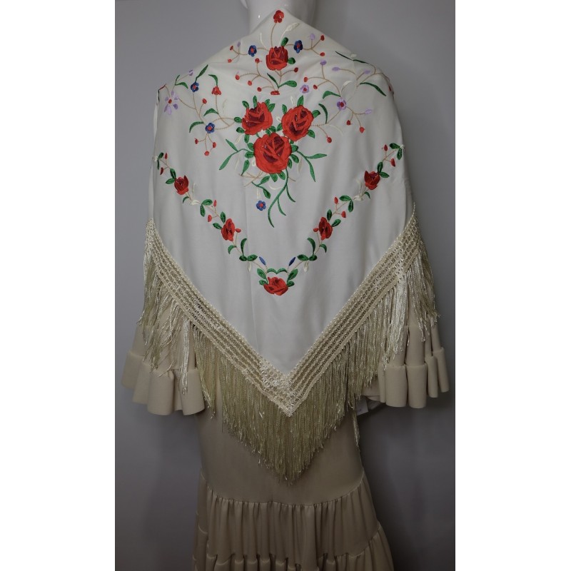 Mantón beig bordado en rojo y verde